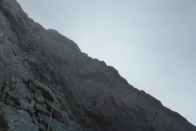 Hannah fulgte på uten større vanskeligheter selv om hun også syntes det var glatt. Tåka kom og gikk på toppen og vi fikk noen glimt av utsikten. Rappellen gikk greit uten tausnag og superfornøyde ruslet vi ned til bilen igjen etter en flott dag i fjellet.